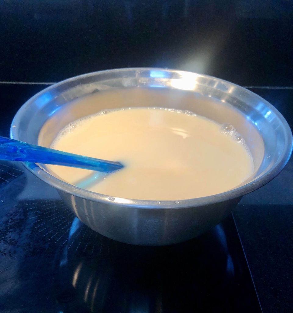 - Place the other liter of water in another container, add the evaporated milk, and condensed milk, mix with a spoon or whisker until all ingredients blend.