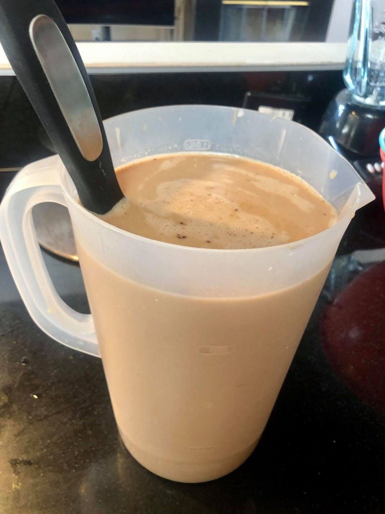 - Add the the liter of milk, and vanilla to the milk mixture and mix all ingredients until they blend.